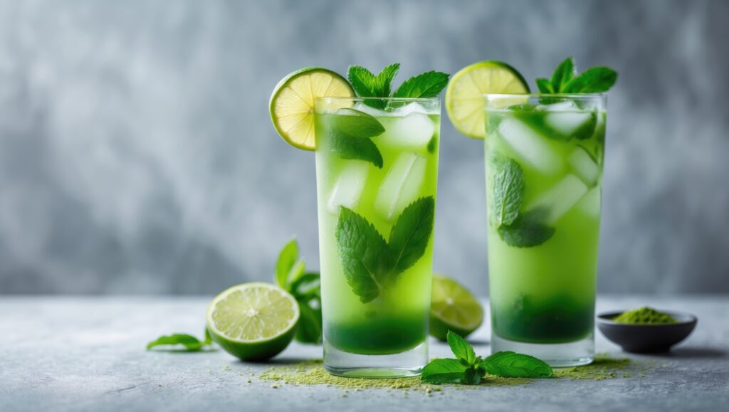 Matcha auflösen → mit Mineralwasser, Zitronensaft und Sirup mischen.